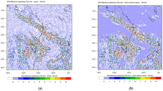 Figure A3 in Appendix B shows the WRF–Chem simulation results of radiation at TOA on 1 December 2019 with wildfires taken into account. To visualise the difference in TOA SW radiation budget between wildfires and without wildfires and the effect of water vapour on downward and upwelling radiation, the SW differences at TOA simulated without and with wildfires and under vapour and without vapour scenarios are shown in Figure 11 for upwelling radiation. The water vapour can scatter and absorb radiation and its presence in the atmosphere do not change the radiation pattern much, with the net effect as noise over the main reflection and absorption pattern due to clouds and aerosols.