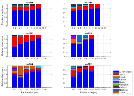 Figure 1 (see also Figure S1A,B in the Supplementary Materials) show an overview of the relative proportions of major particle groups versus particle size. Overall, the chemical composition of the collected dust particles does not show a significant variability during the campaign. As expected, the overall mass composition is dominated by mineral dust aerosol particles during this particular campaign, mainly consisting of different classes of silicates, Si-rich (quartz-like), Ca-rich (calcite-like), CaMg-rich (dolomite-like), and CaS-rich (gypsum-like) particles. These findings are well comparable to previous reports for this location [,,,].