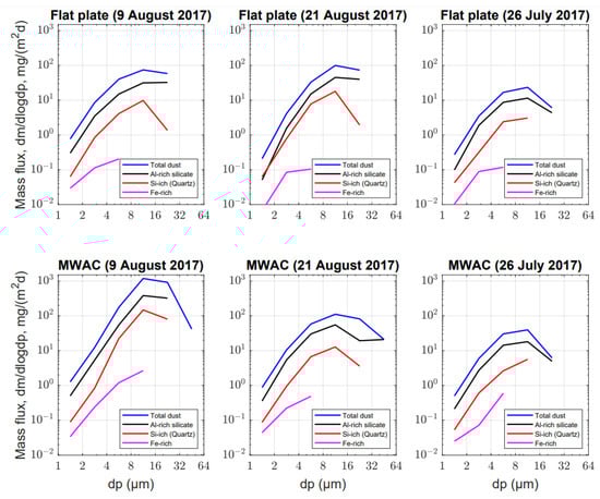 Size resolved mass flux density of total dust and other major mineral dust components. A comparison of the composition between deposited (Flat-plate) and suspended dust particles (MWAC).