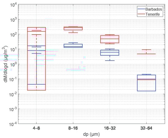 Comparison of atmospheric mass concentration as a function of particle size derived from FWI measurements (Tenerife vs. Barbados). On each blue box, the central mark is the median; the edges of the box are the 10th and 90th percentiles. The vertical lines show the standard deviation.