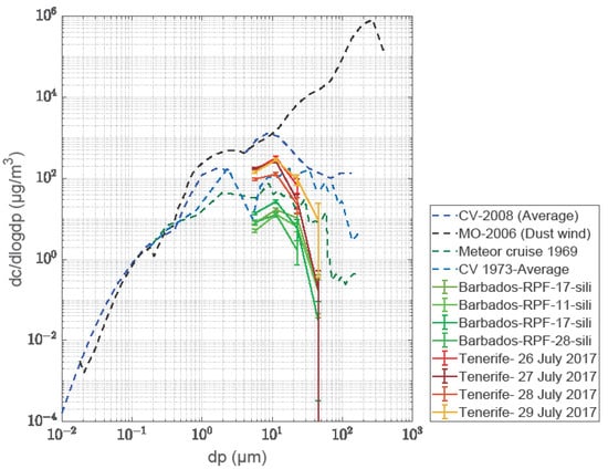 There is a report that the long-range transport of desert dust that PM10 does not change much between Tenerife and Barbados []. However, there is no such report on measurements for large particles. Therefore, in this work, a comparison of mass concentration size distributions from FWI measurements is shown in between these two regions. To the best of our knowledge, this is the first study to show the mass concentration size distribution comparison of large particles in these two regions.
