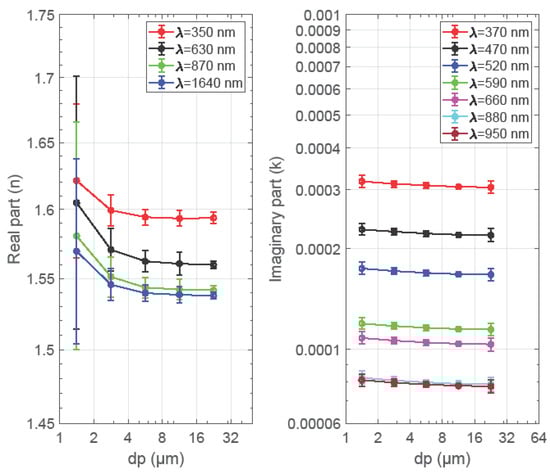 Studies show that the complex refractive index of mineral dust aerosols is mainly controlled by the mineralogical composition of a particle (e.g., [,]). The real and imaginary parts of the averaged refractive index (RI) for all analyzed particles as a function of particle size and wavelength is shown in Figure 5 (see also Figures S3–S13 in the Supplementary Materials). The real (m(λ)) and imaginary (k(λ)) parts show similar spectral behavior, in that both m(λ) and k(λ) at shorter wavelengths have higher values. The real part of the refractive index (m(λ)) at shorter wavelengths is close to 1.61 while the imaginary part of the refractive index (m(λ)) at shorter wavelengths is . The real part is slightly decreasing with increasing particle size, reflecting the decreasing abundance of quartz and calcite particles. Similarly, the imaginary part of the complex refractive index shows a slight decrease with increasing particle size, showing a decreasing abundance of iron oxide with the particle size in the sample [].