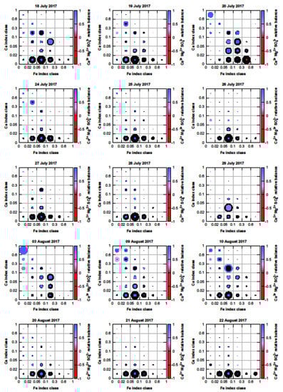 In Figure 6, Fe index class is plotted versus Ca index class, colored according to the aerosol Ca2+ Mg2+ SO42− relative balance. The area of the black circle shows the total Fe mass in the particular index range, the area of the colored circle is the total Ca mass, and the color scale is the Ca2+ Mg2+ SO42− relative balance index. From the figure, we can see that most of the iron particles (the bottom region) carry a little calcium, while some iron particles do not carry calcium at all. Similarly, most of the calcium (mostly in the top region) carries little Fe while some are totally not in contact with much iron. The main message can be therefore summarized as follows: A part of the iron is in particles which do not contain calcium, so acids getting onto these particles can directly react with the iron. On average, 14% of the total deposited Fe mass is accompanied by 10% calcite or more, but more than 70% are in particles with less than 5% calcite, i.e., most of the iron could be, when acids reach the individual particle, directly processed (see also Tables S2 and S3 in the Supplementary Materials). This is different for the present location in comparison to dust in other regions [].