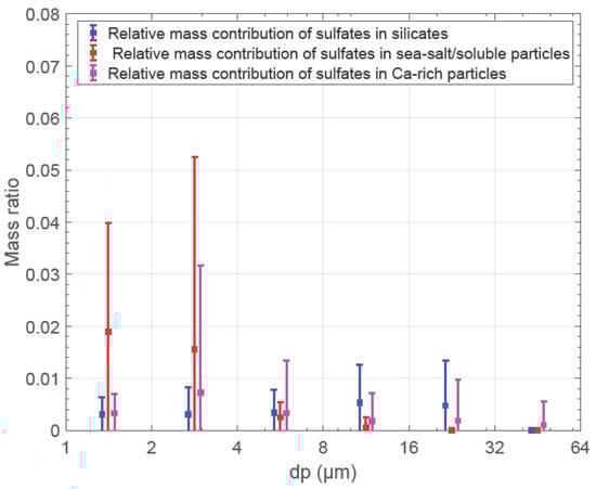 A relative mass contribution of SO42− particles (within silicates, sea-salt/soluble particles, and Ca-rich particles) to the total aerosol mass as a function of particle size is shown in Figure 7 (see also Figure S14a–c in the Supplementary Materials). The particle size distribution of the internally mixed sulfate shows two features. First, the mass of sulfate within sea-salt/soluble particles and Ca-rich particles decreases with particle size. This may imply that mainly fine mode sulfates are internally mixed with sea-salt/soluble particles and Ca-rich particles. Second, for the sulfates internally mixed with silicates, there is a slight increase in sulfate mass with particle size, suggesting that coarse mode silicates are associated with higher sulfate content. However, this trend is very weak.