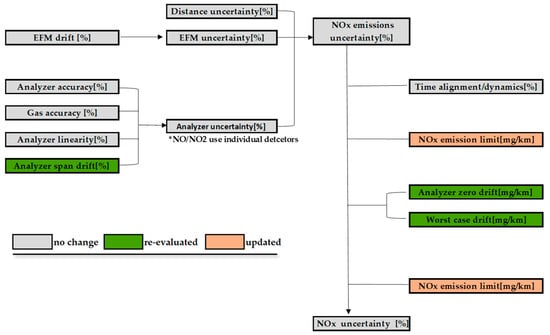 In this framework, distance uncertainty, analyzer accuracy, gas accuracy, and analyzer linearity are determined by the requirements of regulations. Additionally, some factors have been evaluated reasonably by the JRC (Joint Research Centre), such as EFM uncertainty and time alignment/dynamics, which are indicated in gray in Figure 1; therefore, we used the evaluation results of the JRC. The above parameters are beyond the scope of this paper. The NOx emission limit was updated to the China-6b limit. The main aim of this paper was to re-evaluate the analyzer span drift and zero drift. Moreover, the impact of the moving average window (MAW) method was beyond the scope of this paper since the MAW method is not representative [].