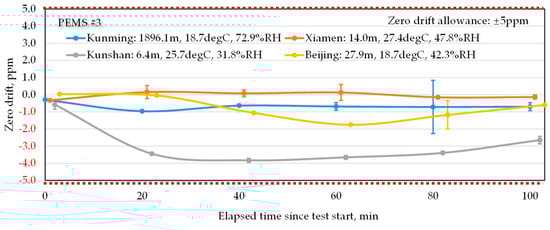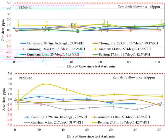 In the 2017 evaluation conducted by the JRC team, two assumptions, namely, linear drift and step drift, were adopted for the estimation of PEMS zero drift, and the permissible limit of 5 ppm for zero drift was used []. Undoubtedly, this method is scientifically sound and logically reasonable, but the research team also pointed out that in future work, the actual performance of PEMS instruments should be evaluated on a proper RDE route, which would substantially improve the practicability of the results. In the JRC 2018–2019 report [], a special case of significant drift was selected for the zero-drift evaluation. The China RDE regulation-making group realized this issue in 2016 and accumulated test data under extreme temperature, humidity, and altitude conditions from 2016 to 2021, which were used in the evaluation reported in this paper.