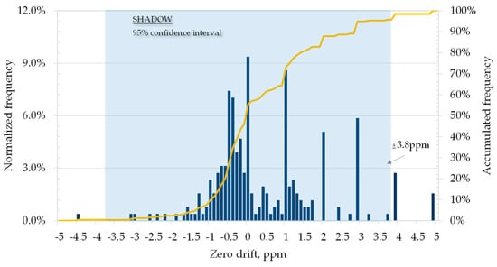 Similar to Figure 3, Figure 6 summarizes the 256 span drift check events from the valid RDE tests. It was found that more than 95% of the span drifts were within a range from −1.5% to 1.5%. Hence, in this paper, a span drift level of 1.5% was used to replace the 2.0% level that the JRC team used in their 2017–2020 report [,,].