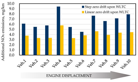 Based on the WLTC, Figure 4 plots the results of the additional NOx emissions calculation using 3.8 ppm drift as input. In this figure, the additional NOx emissions were still calculated using linear and step drift assumptions separately since, according to Figure 2, the zero drift in the RDE measurement behaved like a combination of these two regimes. It can be seen in Figure 4 that over both the WLTC and its low-speed stage, the additional NOx emissions derived from the step drift assumption were always more than 50% higher than those from the linear assumption. Over the WLTC, the maximum additional NOx emissions calculated using the step drift assumption were 9.4 mg/km. The value for the low-speed stage of the WLTC was 14.5 mg/km.