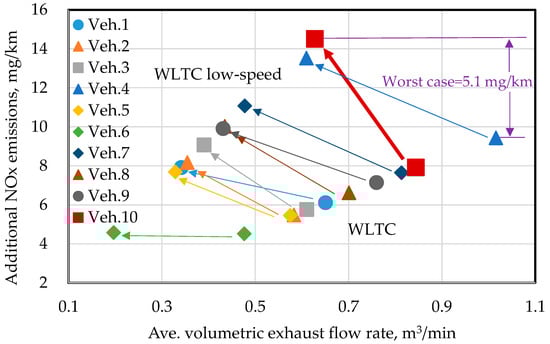 It can also be observed in Figure 4 that neither the additional NOx emissions over the WLTC nor its low-speed stage showed a clear inclination with the physical displacement of the engines. This is due to the employment of turbocharging and hybrid propulsion technologies. In Figure 5 there is an evident correlation between the exhaust flow rate and additional NOx emissions. Figure 5 also helps to identify the worst case of zero drift among the ten test vehicles, which was about 5.1 mg/km.