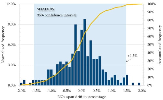 (2) In total, 95% of the span drift events were found to be within 1.5%, and the evaluation using this value showed that span drift only posed a negligible impact on the final calculation of NOx emissions.
