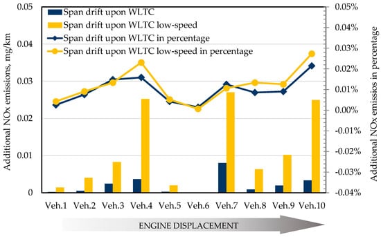 In agreement with the JRC’s assumption of span drift, the span drift was assumed to be linear, with 0% at 0 ppm and 1.5% at the span concentration. We took 1.5% of the span drift into the calculation of additional NOx emissions over the WLTC and its low-speed stage. The results are illustrated in Figure 7. It can be noticed that the influence of span drift at such a level on the final NOx calculation was almost negligible. Even over the low-speed stage of the WLTC, which is the most sensitive stage to span drift, the derived additional NOx emissions were only 0.027 mg/km or 0.027% in percentage, far smaller than the impact of zero drift.