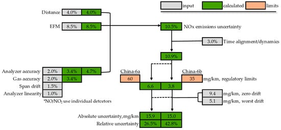 Using the uncertainty framework, Figure 8 presents the combined uncertainty of PEMS NOx measurements using local data collected in China and China-6 limits as input. Corresponding to the 60 mg/km and 35 mg/km limits set for China-6a (effective nationwide from January 2021, delayed due to COVID-19) and China-6b (effective nationwide from July 2023), the calculated PEMS NOx measurement absolute uncertainties are 26.5% and 42.8%, respectively.