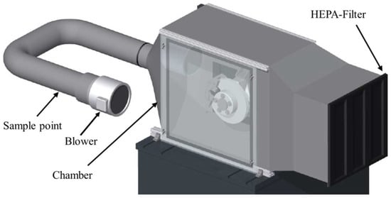 The main component of the setup for fine dust measurement is the TU Ilmenau constant volume sampling system (CVS) with a directly upstream HEPA H13 filter (see Figure 1) [,]. The optimal flow rate range of this system was simulated and experimentally validated for sampling losses using test aerosol to be 750–850 m3/h.