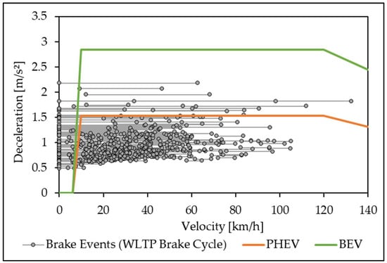 Since the actual generator characteristics and the blending behaviour of the vehicles are not known, a generator power of 85 kW was assumed for the simulation of the PHEV recuperation. The maximum deceleration that can be realised by the generator is thus about 0.156 g (or 1.53 m/s2). The blending range for deceleration at low speeds takes place between 10 and 6 km/h. This results in the PHEV recuperation map shown in Figure 2. Therefore, among the overall 303 deceleration events of the WLTP Brake Cycle, 14 brake events occur purely via the friction brake (a > 0.156 g), 128 events are blended (vend < 10 km/h), and 161 decelerations occur solely by the electric motor (cf., Table 4).