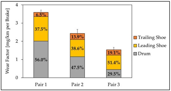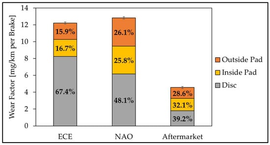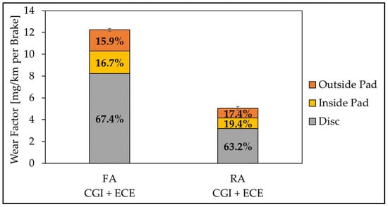 Regarding the entire vehicle brake wear, it is calculated that the total mass loss of the brake system is approximately 34 mg/km/vehicle, whereas each FA and RA brake accounts for 12.2 and 5.0 mg/km/vehicle, respectively. This shows that the majority of the brake mass loss does not fall in the PM10 fraction []. A comparison of the wear factors shows that the rear axle accounts for approximately 29% of the total wear, which is similar to the calculated particulate matter mass ratio (23%). In addition to the comparison of the absolute wear, Figure 3 shows the typical characteristics of friction pairings with ECE brake pads in terms of wear shares. The abrasive pads cause high disc wear, which often accounts for about two-thirds of the total wear.