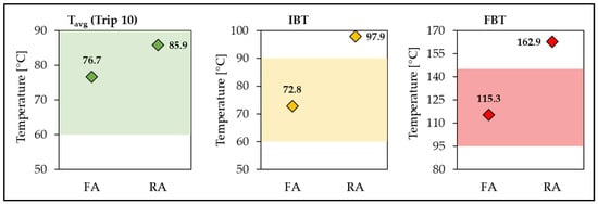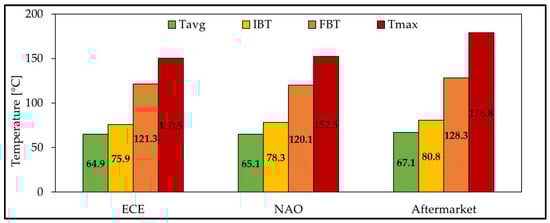 Temperatures of the three different brake pad compositions during WLTP Brake Cycle Trip 10. Tavg—average cycle temperature (Trip 10); IBT—initial brake temperature (reference brake events); FBT—final brake temperature (reference brake events); Tmax—maximum brake temperature.