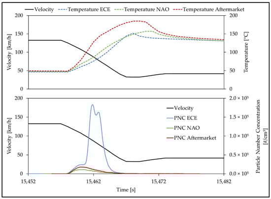 Significant PM reductions can be observed using the aftermarket brake pads. More specifically, it is observed that, compared to the benchmark ECE pads, the aftermarket brake pads emit 68% and 57% less PM10 and PM2.5, respectively. These reductions are very high and seem very promising for the brake systems to meet the requirements of the recently published Euro 7 pollutant emissions proposal. On the other hand, the emission factor of the particle number even slightly exceeds the corresponding value of the ECE reference. Such behaviour can often be attributed to temperature effects, especially local peak temperatures. High temperatures favour the formation of small particles, which have a major influence on the total number of particles [,,,]. In contrast, they are hardly measurable in the mass of fine dust. Figure 6 illustrates an increased peak temperature of the aftermarket friction pairing, which supports such an argumentation in principle.