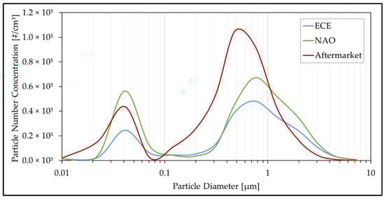 However, it is well known that tribological wear processes differ for different classes of brake pads []. From the comparison of wear in Figure 5, it can be seen that the use of aftermarket brake pads results in even lower disc wear than with NAO pads on the same disc. As a result, the worn-off material of the brake pads is thus increasingly responsible for the formation of the tribofilm. This is also reflected in the emission of fine dust particles. Figure 9 shows the averaged particle size distribution of the secondary emissions at the start of the Trip 10 112 km/h cruising. This shows, firstly, the higher absolute emissions of the aftermarket friction pairing in direct comparison, and secondly, a shift in the coarse mode to small particle diameters. Accordingly, the relatively high secondary emissions of the aftermarket friction pairing is quite plausible and shows nicely how important it can be to reset the brake pads when the brakes are not applied.