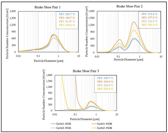 An ELPI was used to study the particle number distribution. Figure 10 shows the mean particle number concentration curve for the two brake events with the highest initial velocity (#101 and #106) from Trip 10. These are very well suited to identify ultrafine particles in the WLTP Brake Cycle []. The figure shows that pair 1 and pair 2 emit a reproducible size distribution. This is not the case for pair 3. For the two brake events from 132.5 km/h (#106), the emission of small particles is exponentially increased. Comparing the final braking temperatures of the different friction pairs with each other, it is noticeable that there is a clear increase from pair 1 to pair 3. Friction pairing 3 has up to 70 °C higher final braking temperatures (FBT). Thus, the friction pairing probably tends to nanoscale particles due to higher braking temperatures. With this insight, the result from Table 8 should be viewed critically. Owing to the thermal preconditioning of the particle counter, volatile particles are eliminated and are not visible in the PN2.5 value.