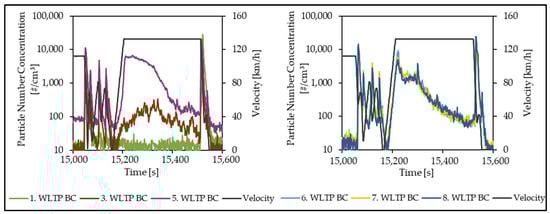 Evolution of particle number concentrations (SPN measured with CPC) during an excerpt of WLTP Brake Cycle Trip 10.
