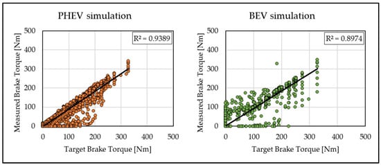 The simulation of the BEV, also shown in Figure 2, uses the same brake blending range between 10 and 6 km/h. Owing to the higher generator power of 115 kW, the BEV’s electric motor is capable of decelerations up to 0.29 g (or 2.84 m/s2). Therefore 166 brake events are performed exclusively by the electric motor, while for 137 decelerations brake blending takes action (cf., Table 4).