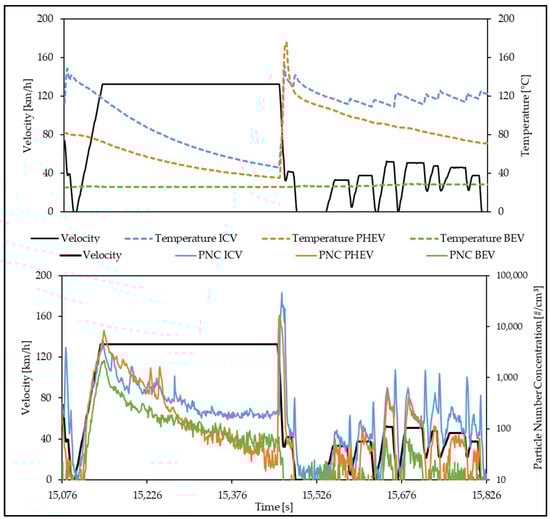 The background to this consideration is the influence of temperature peaks on the emission behaviour of tribological friction systems, and particularly on the PN emissions of brake systems. Peak temperatures greater than 220 °C were measured in the rear-axle brake system (data not shown). Although no increased concentration of nanoscale volatile particles could be detected in the course of these investigations, it is known that, depending on the brake pad composition, significantly lower temperatures can already contribute to the emission of ultrafine dust. This type of fine dust is primarily relevant for the emission factor of the particle number, since the presence of ultrafine particles usually results in an exponential increase in the particle number concentration. This is described in more detail in [].