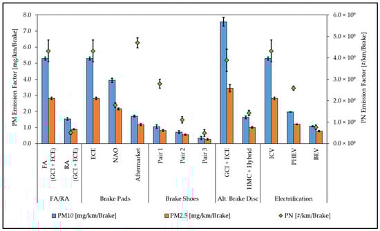 The ability of electrified vehicles to generate braking torque through the electric motor (recuperation) reduces load on and use of friction brakes—and thus the energy dissipated—on the mechanical brakes. The potential for reducing PM and PN emissions depends primarily on the performance of the electric machine in combination with the battery management system [,].