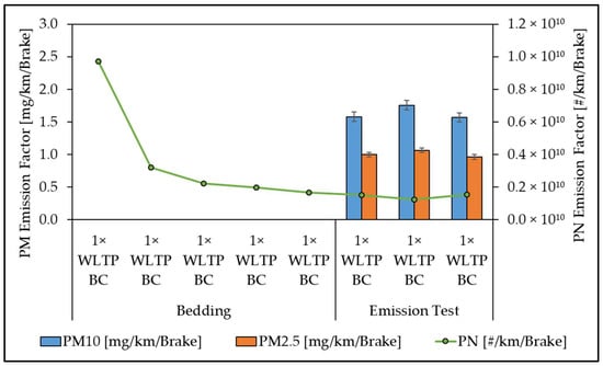 During the emission measurements of the brake drums, it was also noticed that the secondary particle emissions increase with each continuing WLTP Brake Cycle iteration until they stagnate at a constant level. The progression over the bedding and main emissions test is shown in Figure 11.