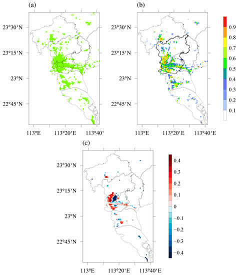 Diagrams showing the urban fraction (UF): (a) model default value, (b) localised value, and (c) difference between the localised and default values.
