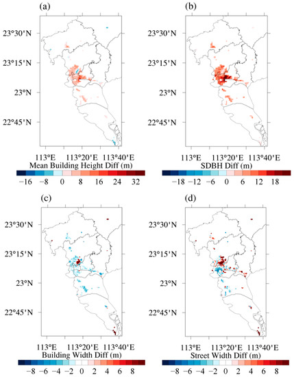 UM is another important urban-scale UCP. The single-layer urban canopy scheme includes four urban morphology parameters, namely building width (BW), street width (SW), mean building height (BH), and standard deviation of building height (SBH). Similar to UF, the UM values were fixed in the default model; in low-density residential areas, the default values of BH, BW, and SW were 5 m, 8.3 m, and 8.3 m, respectively, and SBH was set at 0 m.