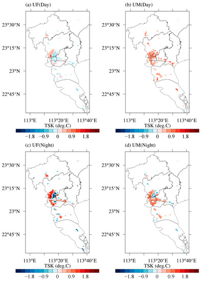 Impact of the high-resolution UF and UM on the daytime and night-time mean surface skin temperature (TSK) in the underlying surface of Guangzhou. Here, the impacts of UF/UM during the daytime were calculated by comparing the simulated hourly TSK values from 08:00 LST to 16:00 LST for 10 days (from 1 to 10 November) in two experiments and then averaging the result. meanwhile, those during night-time were derived using the data from 17:00 LST to 07:00 LST. (a,c) Effect of UF (Case 1–Base); (b,d) effect of UM (Case 2–Base).