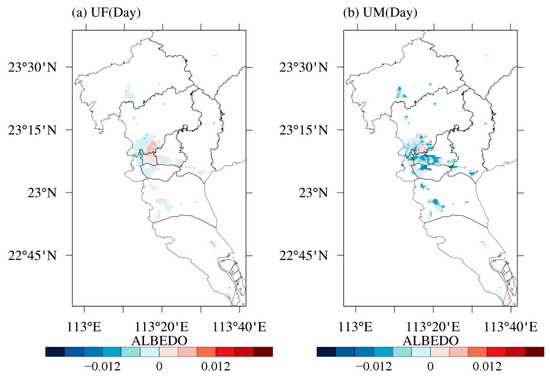 Impacts of the high-resolution UF and UM on the average albedo during the daytime in the urban underlying surface of Guangzhou. Here, the impacts of UF/UM during daytime were calculated by comparing the simulated hourly albedo values from 08:00 LST to 16:00 LST for 10 days (from 1 to 10 November) in two experiments and then averaging the result. (a) Effect of UF (Case 1–Base); (b) Effect of UF (Case 1–Base).