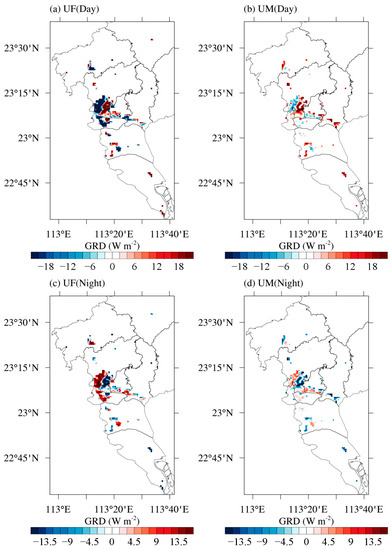 GRD is generally negative during the daytime and positive at night. During the daytime, heat is transferred from the surface to the ground, and at night, heat is conducted from the ground toward the surface. Figure 6 shows the effect of high-resolution UF and UM parameters on the mean GRD for the daytime (08:00–16:00 LST) and night-time (17:00–07:00 LST) in the underlying urban surface of Guangzhou. During the daytime (Figure 6a,b), negative values (blue shading) indicated increased GRD and positive values (red shading) indicated decreased GRD. It is evident from Figure 6a that, during the daytime, the increased UF value (0.53) in the urban-centre districts increased the heat transfer from the surface into the ground by 2.690 W/m2, whereas in the suburban districts, the reduced UF (0.36) decreased the heat transfer from the surface to the ground by 14.244 W/m2. Similarly, the high-spatial-resolution UM parameters also notably increased the GRD in the districts (Figure 6b) with narrowed street canyons (Figure 3d). This phenomenon was related to the TSK in those districts: as the UF increased and street widths decreased, the TSK increased, ultimately resulting in higher heat transfer from the surface to the ground. During the night-time (Figure 6c,d), positive values (red shading) indicated increased GRD, and negative values (blue shading) indicated decreased GRD. As the soil heat storage increased during the daytime, in the districts with greater UF values, the amount of heat transferred from the ground to the surface at night also increased (central districts: 1.076 W/m2). With the high-resolution UM parameters, the street canyon widths in some areas of the YX, HZ, TH, and BY districts were decreased, so the heat storage of soil during the daytime and the amount of heat released at night increased in those districts. In contrast, in the districts in which the street canyon widths increased, the heat storage of soil during the daytime was reduced (Figure 6d). Therefore, in the districts where the street canyon widths decreased, the heat flux from the ground to the surface increased, resulting in an increase in the night-time TSK in the corresponding districts; in the districts where the street canyon widths increased, the heat flux from the ground to the surface decreases, resulting in decreased night-time TSK in those districts.