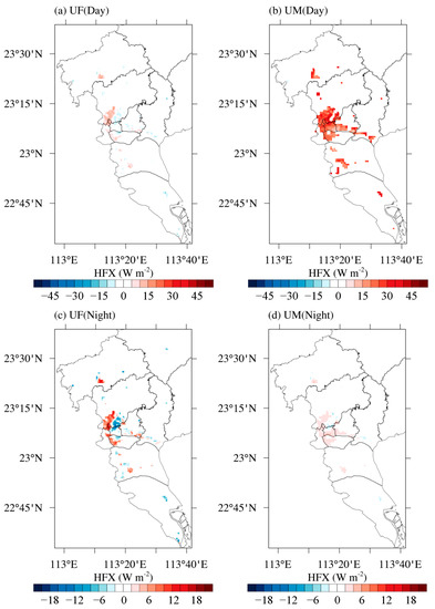 Figure 7 shows the effect of the high-resolution UF and UM parameters on the daytime and night-time sensible heat flux (HFX) in the underlying urban surface of Guangzhou. In general, the HFX is positive during the daytime and negative at night. In Figure 7a,b, positive values (red shading) indicate increased HFX during the daytime, and negative values (blue shading) indicate decreased HFX during the daytime; in Figure 7c,d, negative values (blue shading) indicate increased HFX at night, and positive values (red shading) indicate decreased HFX at night. It is evident from Figure 7 that, as the UF increased (decreased), the daytime HFX increased (decreased); at night-time, as the UF increased (decreased), the HFX decreased (increased). The high-resolution UM parameters caused a notable increase in HFX during the daytime (urban districts: 20.547 W/m2 and suburban districts 22.731 W/m2) and a slight decrease in HFX at night (urban districts: 3.272 W/m2 and suburban districts: 1.107 W/m2).