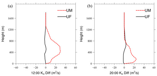 Effects of the high-resolution UF and UM on the vertical distribution of the simulated heat exchange coefficient in the underlying surface layers of the Tianhe District during the daytime ((a) 12:00 LST) and night-time ((b) 20:00 LST). The heat exchange was is calculated online with the simulation and outputted by the WRF model.