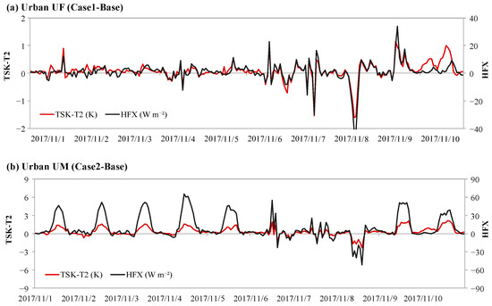 Mean time series of the impacts of the high-resolution UF and UM on the simulated TSK—T2 and HFX in an urban centre. (a) Effect of UF (Case 1—Base); (b) effect of UM (Case 2—Base).