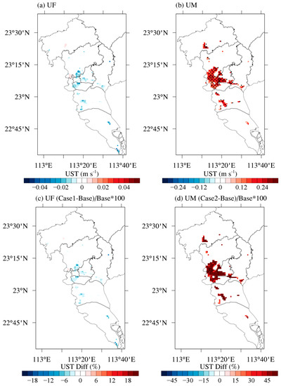 Impacts of the high-resolution UF and UM on the average friction velocity (UST) in the urban underlying surface of Guangzhou. Here, the impacts of UF/UM were calculated by comparing the simulated hourly UST values for 10 days (from 1 to 10 November) in two experiments and then averaging the result. (a) UF (Case 1—Base) impact; (b) UM (Case 2—Base) impact; (c) percentage change due to UF (Case 1—Base)/Base × 100; (d) percentage change due to UM (Case 2—Base)/Base × 100. In (a,b), statistically significant changes above the 99% confidence level are marked with black dots.