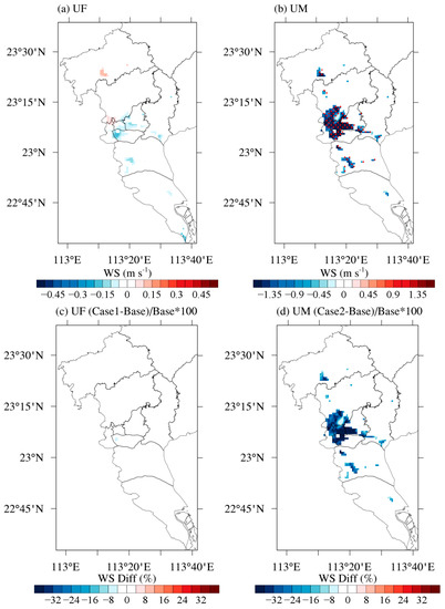 Impacts of the high-resolution UF and UM on the average 10 m wind speed (WS) in the urban underlying surface of Guangzhou. Here, the impacts of UF/UM were calculated by comparing the simulated hourly WS values for 10 days (from 1 to 10 November) in two experiments and then averaging the result. (a) UF (Case 1—Base) impact; (b) UM (Case 2—Base) impact; (c) percentage change due to UF (Case 1—Base)/Base × 100; (d) percentage change due to UM (Case 2—Base)/Base × 100. In (a,b), statistically significant changes above the 99% confidence level are marked with red dots.