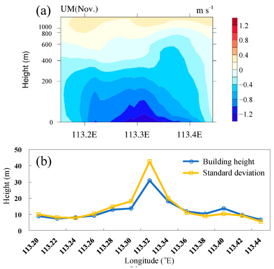 The effect of the high-resolution UM on wind speed was significantly (p < 0.01) greater than that of the UF (Figure 11). The high-resolution UM caused a significant decrease in wind speed in both the urban-centre and suburban districts (urban-centre districts: 1.504 m/s and suburban districts: 0.749 m/s), with changes of 33.50% and 15.77%, respectively. The high-resolution UM generated greater building heights, resulting in increased surface roughness and decreased wind speed. In addition to affecting the spatial distribution of wind speed, the high-resolution UM had a certain impact on the vertical distribution of wind speed. Figure 12a shows how the UM affected the vertical distribution of the horizontal wind speed along the latitude of 23.116° N, passing through the LW, YX, TH, and HP districts. It is shown that the UM caused a notable decrease in the simulated horizontal wind speed vertically in the urban canopy, with its effect on the near-surface wind speed being more obvious. As the height increased, the effect of UM on wind speed decreased, and the effect of UM on wind speed was the most obvious below a height of 400 m. As the building heights in the YX and TH districts (Figure 12b) increased, the wind speed decreased significantly in those districts (around 113.3° E).