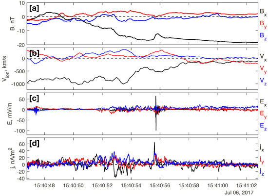 Figure 1 shows an overview of the magnetic and electric fields, ion bulk flow velocity and the electric current density observed by the MMS spacecraft on 6 July 2017 between 15:40:47 UT and 15:41:03 UT. The data shown are measured in the burst mode and are obtained in the barycenter of the MMS tetrahedron configuration. The geocentric solar ecliptic (GSE) coordinate system is used everywhere in the paper.