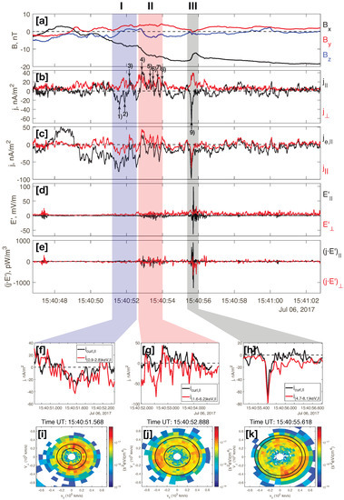 From top to bottom: (a) Three components of the magnetic field; (b) the parallel and perpendicular components of electric current density calculated using the curlometer technique; (c) the parallel component of the electric current density calculated at the MMS barycenter using electron moments from the FPI experiment onboard four MMS probes () and the parallel current density calculated by using the curlometer technique (); (d) the parallel and perpendicular components of the nonideal electric field, E’; (e) the parallel and perpendicular components of energy dissipation. Three intervals of FACs are shaded by blue, pink and grey colors and are marked as “I”,”II” and “III”, respectively. Panels (f–h) present a comparison of and calculated by using electron moments deduced from 3D electron velocity distribution function in the selected energy range. The energy range used for the current density calculation in each FAC interval is presented in the legend of each panel. Panels (i–k) show 2D cuts of electron velocity distribution functions in the plane.