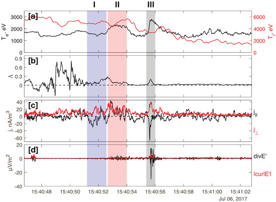 The energy dissipation processes should affect the ambient plasma population. Figure 3a presents the time profiles of electron () and ion () temperatures, shown by the black and red lines, respectively. During the interval “I”, both components of were almost zero, and significant increases in ion and electron temperatures were not observed. During the interval “II”, the electron temperature increased from ∼1500 eV up to ∼2300 eV within the FAC structure. An increase in the ion temperature was also observed, but it was delayed relative to the increase in , so that the local maximum of was observed outside the FAC structure and, probably, was not caused by the energy dissipation at the electron scale within the FAC structure. The strongest increase in was detected within the earthward FAC during the interval “III”, when the largest value of was registered. At this time increased from ∼1500 eV up to ∼2800 eV within the FAC structure. The ion temperature almost did not change at this time, so that ion-to-electron temperature ratio decreased to ∼1.2. Thus, within the FAC structures ‘II” and “III”, the energy dissipation processes caused significant electron heating and the increase in by a factor of (1.5–2) compared to that outside the FAC structures.