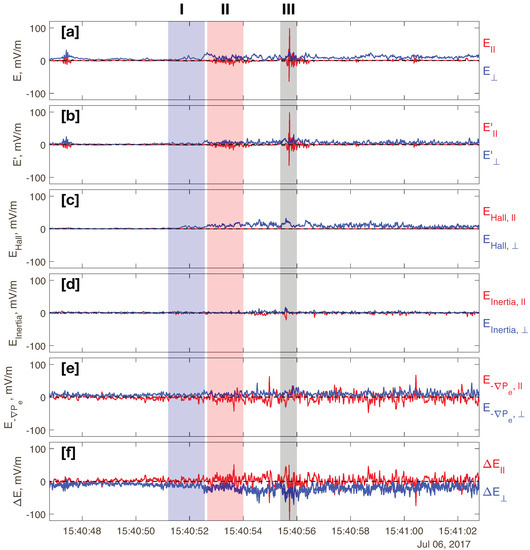Figure 2d shows the time profiles of the parallel (shown by the black line) and perpendicular (shown by the red line) components of the nonideal electric field. The nonideal electric field was calculated as , where is the electron bulk velocity. During the interval “II”, E′ variations with amplitudes ∼15 mV/m were observed both in the parallel and perpendicular components. During the interval “III”, the strong bipolar variations of the parallel E′ with amplitude up to ∼100 mV/m were registered near the edge of the -spike. The amplitude of perpendicular E′ was much smaller. The non-zero value of the nonideal electric field denotes the violation of a frozen-in condition even for electrons.