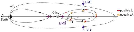 - Phan, T.D.; Eastwood, J.P.; Cassak, P.A.; Øieroset, M.; Gosling, J.T.; Gershman, D.J.; Mozer, F.S.; Shay, M.A.; Fujimoto, M.; Daughton, W.; et al. MMS observations of electron-scale filamentary currents in the reconnection exhaust and near the X line. Geophys. Res. Lett. 2016, 43, 6060–6069. [Google Scholar] [CrossRef]