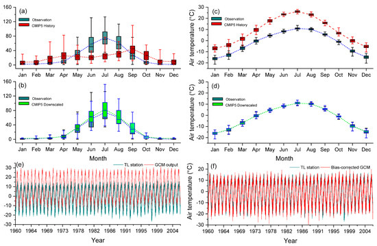 (a,b) Comparison of the monthly total precipitation for the raw GCM outputs, downscaled precipitation, and measurements of TL stations. (c,d) Comparison of the monthly mean precipitation for raw GCM outputs, observation, and the bias-corrected results. In the box-and-whisker plots, the centerlines represent the ensemble means, box limits indicate the 25th and 75th percentiles, and whiskers denote minimum and maximum values of the ensemble of 31 ensembles of GCM outputs. (e,f) Comparison of the mean daily air temperature for observation, raw GCM, and the bias-corrected GCM results.