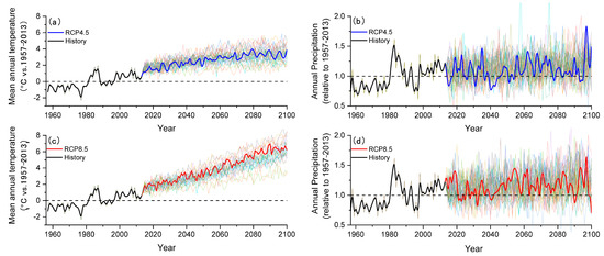 De-biased temperature anomaly (a,c) and de-biased precipitation anomaly (b,d) between 1957 and 2100 relative to 1957–2013 (horizontal dotted line). The thick black line represents the variables’ progress across the observation period. The colored thin lines reflect the evolution of each GCM simulation in the CMIP5 ensemble (31 in total; see Table 1). The thick red and blue lines are the means of GCM simulations.