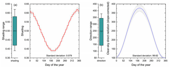 Annual slope corrected clear-sky potential radiation (a) and shading (b) at Qiyi Glacier surface. The centerlines in the box-and-whisker plots represent the mean, the box bounds refer to the 25th and 75th percentiles, and the whiskers represent minimum and maximum values. The error bars indicate a 5% percentage deviation.