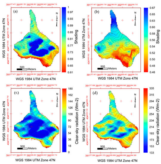 Spatial distribution of shading (a,b) and the slope corrected clear-sky potential radiation (c,d) in winter and summer seasons at the Qiyi glacier surface.