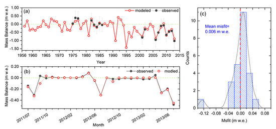 Evaluating modeled SMB against in-suit observations at Qiyi glacier. Linear plots (a,b) refer to the modeled annual and monthly glacier-wide SMB vs. observations. The frequency of misfits (c) is modeled vs. measured glacier-wide monthly SMB. Error bars in (a) indicate the 1 δ standard deviation. In (a,b), dashed green lines mean the zero of SMB. In (c), the dashed red line represents the zero misfit.