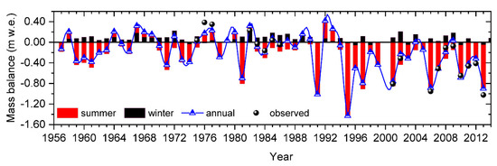 4.2. The Temporal Variation of Reconstructed Mass Balance during 1957–2013